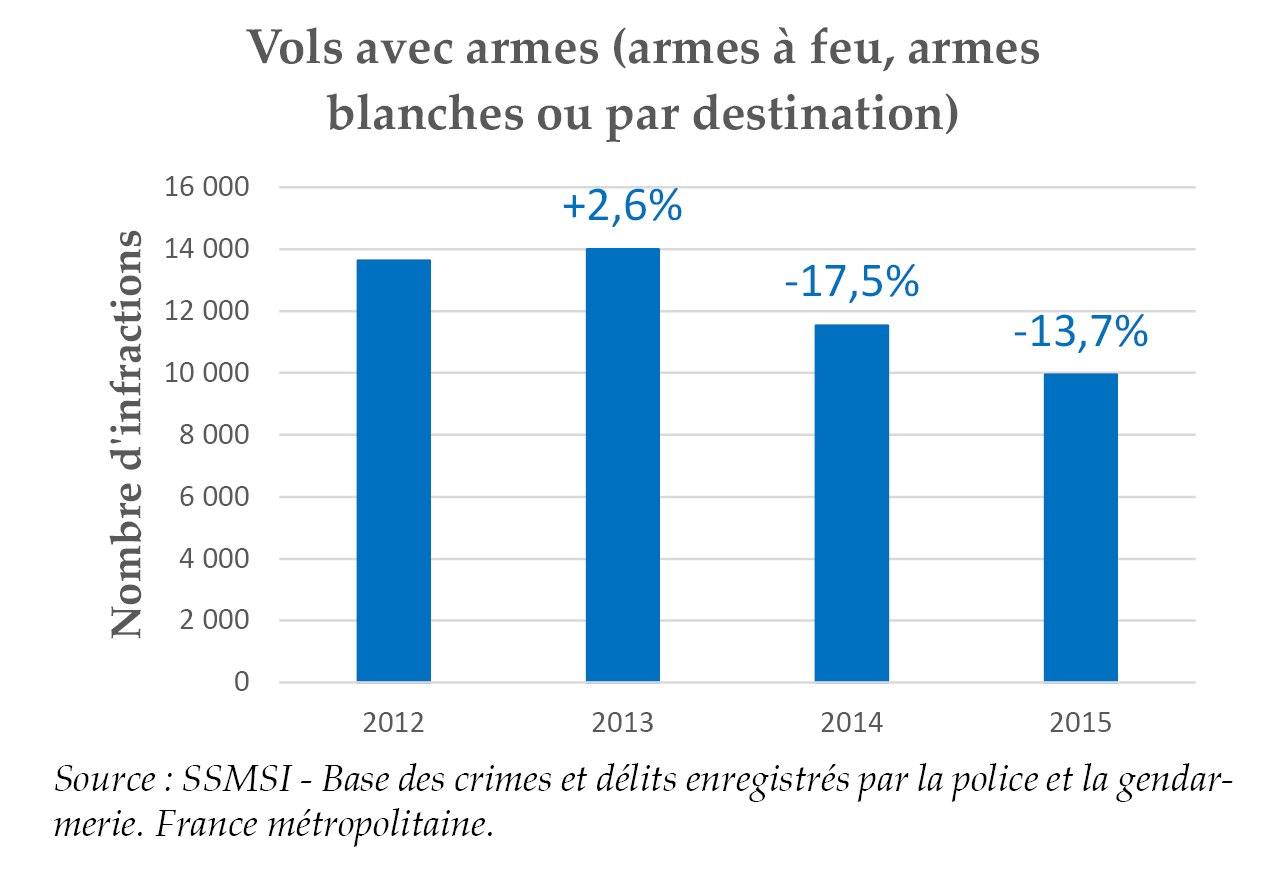 Le ministre s'est félicité d'une baisse du nombre de vols à main armée de plus de 13% en 2015 par rapport à 2014. Les vols sans violence ont également diminué : 690 082 contre 699 855 en 2014. Cette baisse de 1,4% survient après des années de hausse (+4,3% en 2014 et +5,9% en 2013). Plus étonnant encore, Interstat a évoqué dans son communiqué "une baisse marquée des faits constatés en janvier et février 2015, de même qu’en novembre et décembre, dans le sillage des attentats à Paris".
